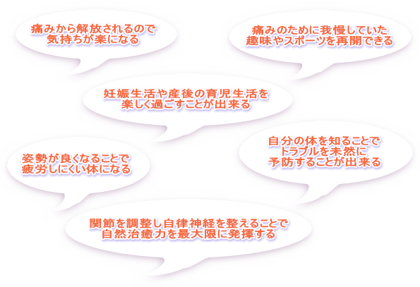 骨格・筋肉・神経が整うことで、本来人間に備わっている自然治癒力を最大限に発揮することが出来ることも効果のひとつです。